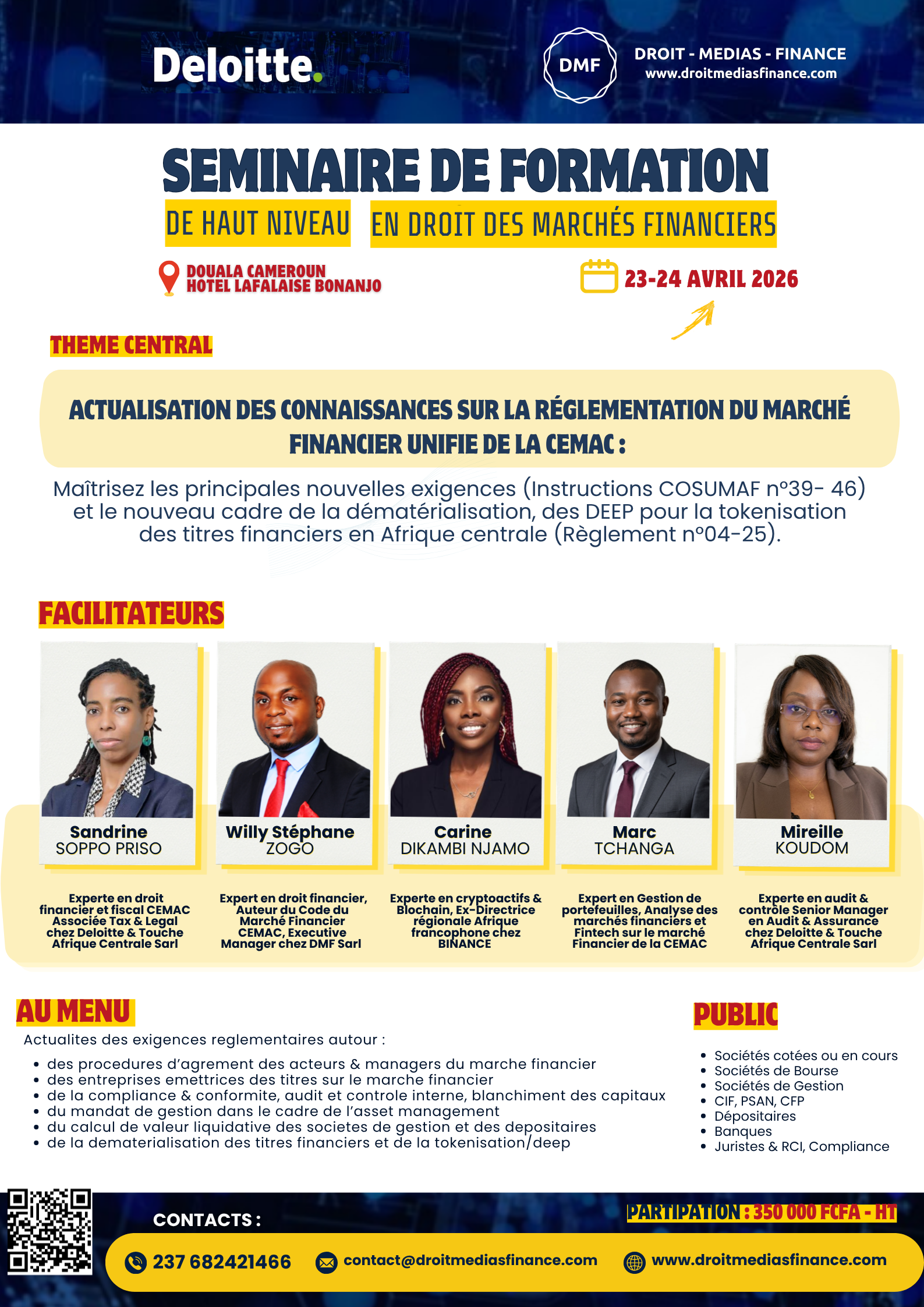 INSCRIPTION A CE SÉMINAIRE HAUT NIVEAU SUR L'ACTUALISATION DE LA CONNAISSANCE DE LA RÉGLEMENTATION DU MARCHÉ FINANCIER CEMAC : REMPLIR ICI : https://forms.gle/RU7FABunH1cAyM736